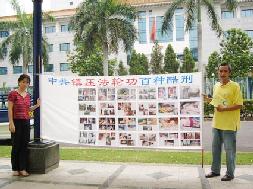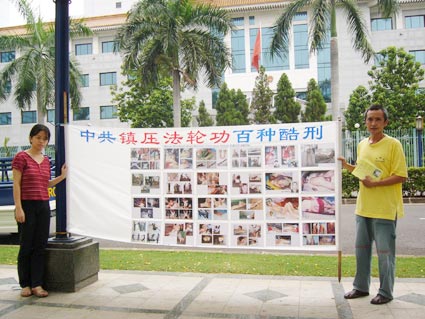![]() 看过中共百种镇压法轮功的酷刑图后,人们不无为之震惊 | ![]() “中共镇压法轮功百种酷刑”图展,后面背景是中共驻雅京大厦 |