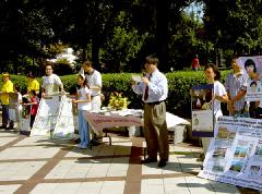 ![]() 大法展位 | ![]() 向游客介绍大法书籍 |