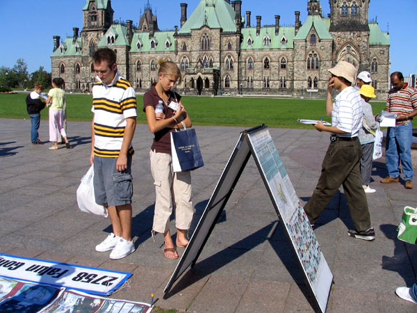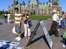 【明慧网2005年9月15日】自胡访北美以来,加拿大的法轮功学员继续在国会山庄前,持续举办反