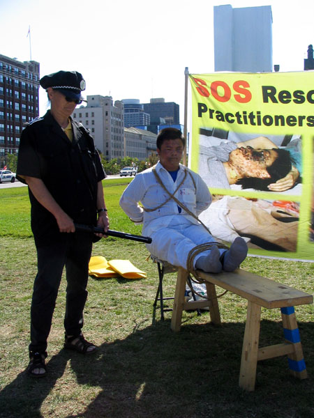 刚从中国来的学员在扮演警察,参加酷刑展。
