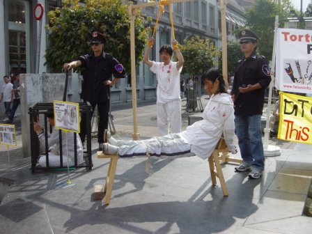 反酷刑展由学员演示他们的同修在中国受到的残酷迫害。为了迫使法轮功学员放弃他们的信仰,中共不惜一切手段执行江×ד消灭法轮功”的命令。