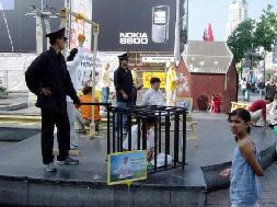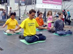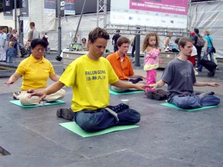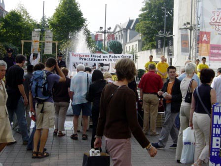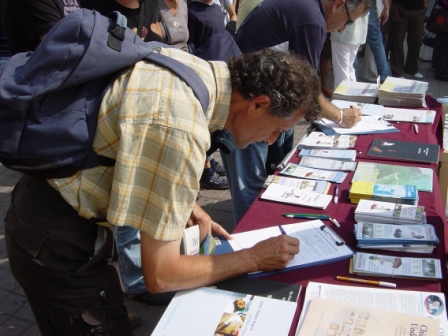 许多人驻足观看我们的反酷刑展和祥和的功法表演。他们也索取我们的传单以了解更多的法轮功真象,并在为营救受迫害的法轮功学员的遗孤到海外的请愿书上签名。