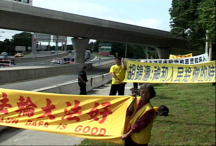中共这次为了欢迎胡,雇来了大批的留学生,并企图不让胡看到法轮功的横幅。但是酒店的四周都有法轮功学员手持横幅。下午3点多,胡的车队害怕从有许多法轮功学员的正门进入酒店,而是走了向酒店的后门。结果胡锦涛的车队还是无法躲过早已等在后门旁边的法轮功学员,以及学员手中的横幅。