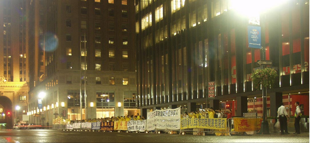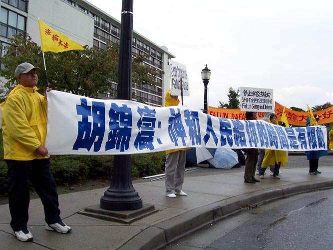 9月14日清晨8点半左右胡锦涛离开酒店去联合国,车队从酒店刚出来时,正好遇到法轮功学员。当时在场的法轮功学员王先生说,先是一个学员举起了横幅“胡锦涛,神和人民给你的时间是有限的”,接着旁边两条横幅也举了起来,几乎同时,胡锦涛车队迎着这些横幅开出,响亮的“法轮大法好”的声音此起彼伏。这些场景紧凑在一两分钟之内发生,如安排好的一样。