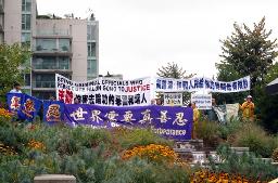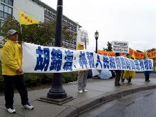 上午7、8点钟时,沃道夫酒店的南门就聚集了很多的中国人,显然是胡锦涛的随从,要离开酒店去机场。学员们在对面的人行道上展开了“法轮大法好”,“ “停止迫害法轮功”等横幅,一遍又一遍的大声呼唤“法轮大法好”,“胡锦涛,神和人民给你的时间是有限的”,“停止迫害法轮功”等。