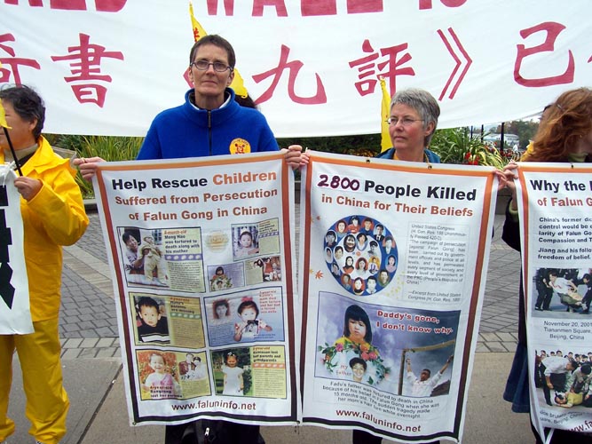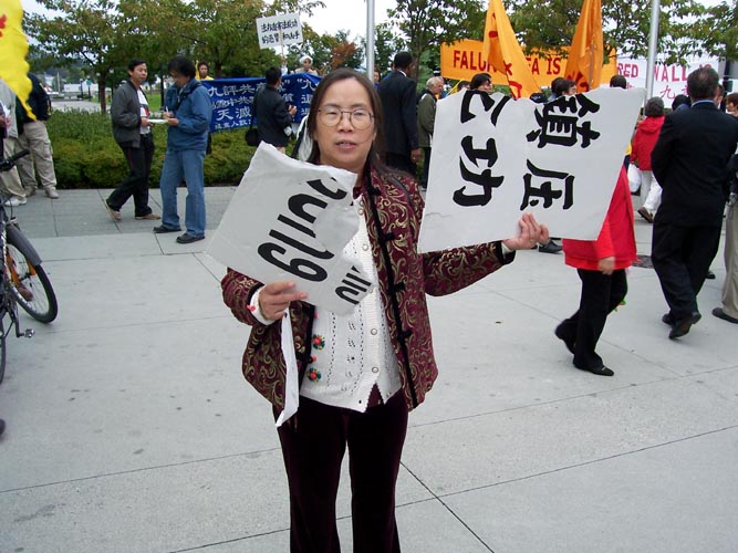 温哥华法轮功发言人李樱表示,今天来到这里主要是向胡锦涛呼吁,要求法办江泽民、罗干、刘京和周永康,法办迫害法轮功的恶警和坏人,第三,我们想向胡锦涛表达,神和人民给他的时间是有限的。因为迫害是由江泽民一手发起的,但迫害还一直延续着。
