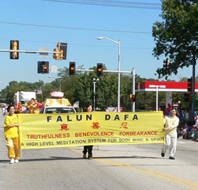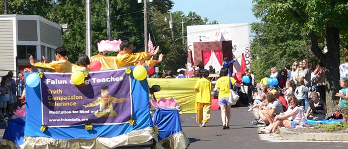 【明慧网2005年9月19日】2005年9月17日,美国圣路易法轮功学员第四度参加了科克伍得(Kirkwood)绿树节(Green Tree Festival)游行。当天天气晴朗宜人,人们纷纷来到户外观赏游行。如往年一样,法轮功学员的精美花车、功法展示、真象材料等获得民众的热情欢迎。