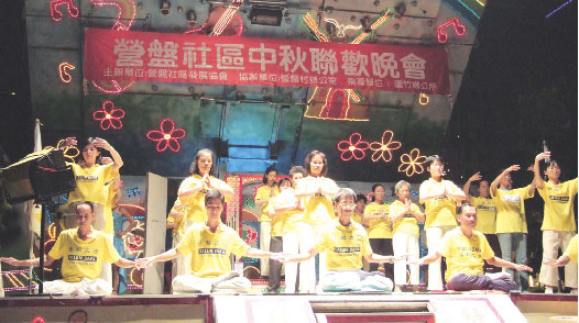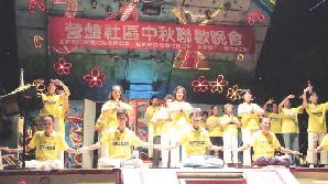 【明慧网2005年9月21日】秋节时分,什么样的活动才是最有意义的?2005年9月18日夜晚,月色分外明朗,金风送爽,月团圆、人团圆。台湾北桃园南嵌民众聚集在六福路欢庆中秋,人气喧腾,乐声交响。南嵌地区的法轮大法学员参与营盘社区中秋联欢晚会表演,一缕宁静在热闹纷飞中独自美。