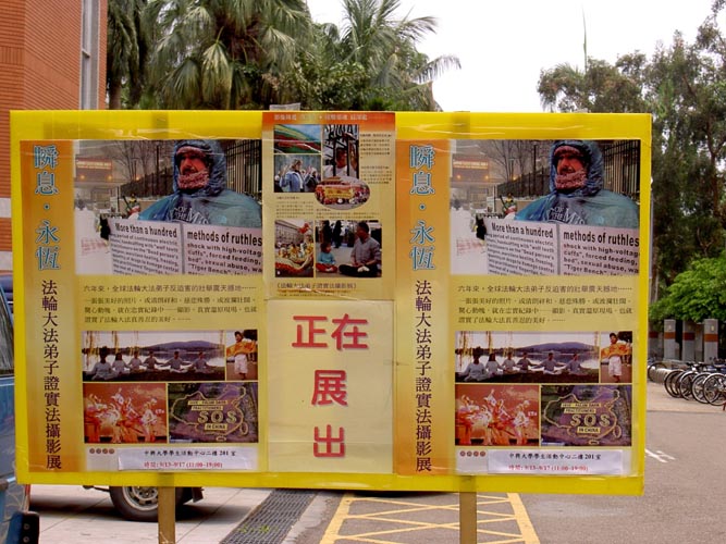 十三至十七日摄影展在台中市中兴大学举行。活动由中兴大学法轮功社团主办,由于校方的大力支持,摄影展顺利的在学生活动中心二楼展出。一百四十幅影像纪录了十三年来法轮大法洪传世界七十多国,不分种族、性别、年龄的有缘人走入修炼与炼功的祥和美好;以及六年多来在中共铺天盖地的打压下,中国法轮功学员被迫害的极为严重,却依然坚持和平、理性的向人讲真象,舍生忘死的证实法轮大法的动人壮举;与世界各国学员不懈的利用各种机会声援中国法轮功同修,让世人明白真象的历史镜头。