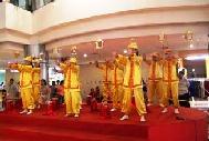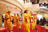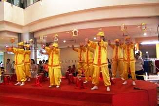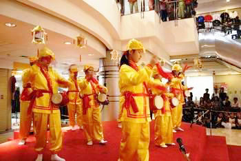 17日首次演出,独特的音乐吸引观众的好奇,纷纷从上层楼凭栏俯览探个究竟。一位主流媒体记者无意中因看到腰鼓队亮丽的服装,对中国传统的腰鼓发生兴趣,又萌生更深入了解法轮功的意愿。