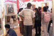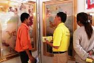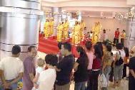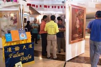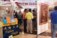 18日演出,有更多的人听到音乐响起,纷纷围观起来,聚集在三楼的舞台四方。炼功演示后,更有的人随着演出人潮到楼下展位,再次观赏真善忍图画与图片展。好多观众“光顾”展位,反复看了几回。