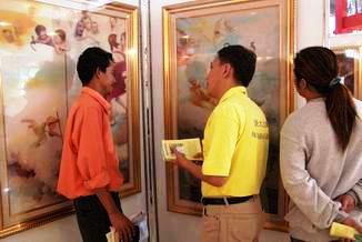有人对摆放的印尼文、中文版、英文版《转法轮》爱不释手,还表示,印尼文版给孩子看,他自己读中文版。后来他又看到《精進要旨》,更是逐字逐句、如饥如渴的阅读。