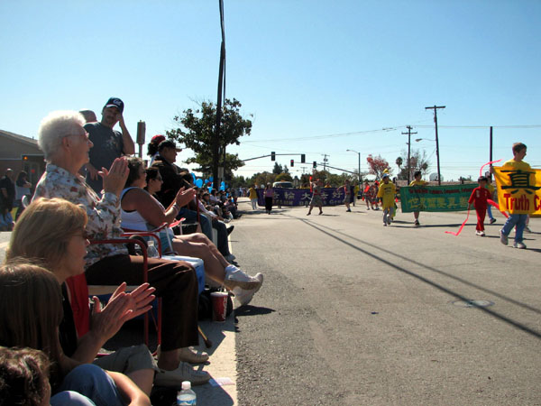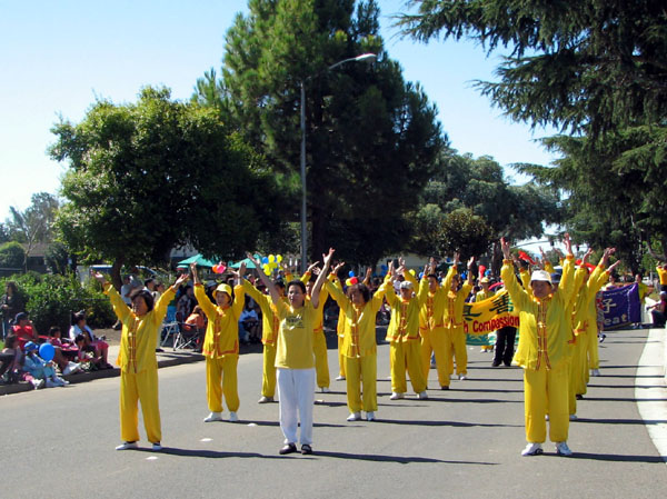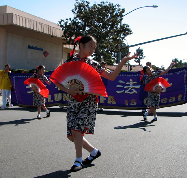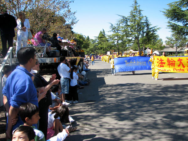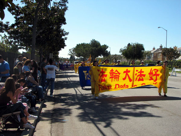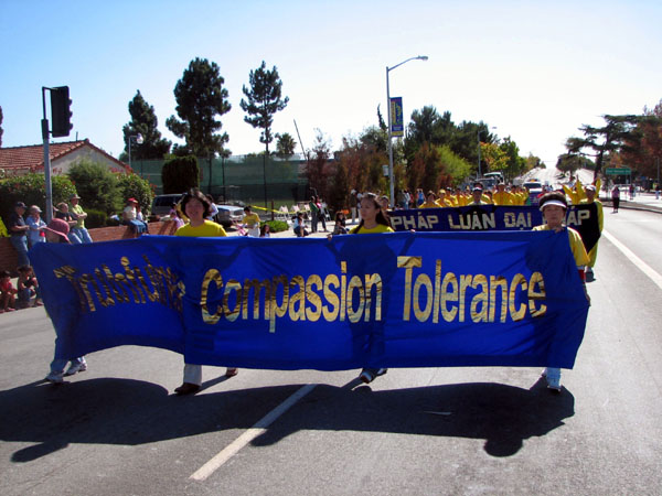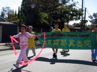 法轮功队伍分为腰鼓队,炼功队,小弟子的舞蹈队,还有的学员打出“法轮大法”、“真、善、忍”、“世界需要真善忍”等横幅。一位警察看到越南文的“法轮大法真善忍”的横幅时,就对学员说,他的女朋友是越南人。他接着说:“法轮功真棒。”