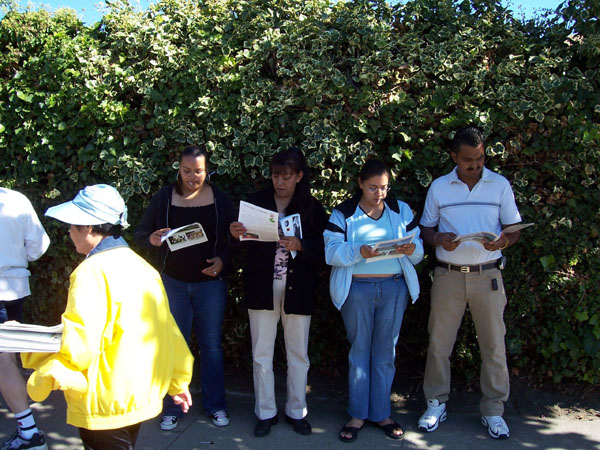 学员于是给了她一张真象传单,并告诉她,上网可免费下载功法示范跟着学,法轮功的著作《转法轮》业可免费下载。学员强调看书很重要,书能指导人如何做到真、善、忍;并告诉她附近的炼功点。她兴奋的抓着学员的手,一再说谢谢。