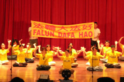 ![]() 法轮功社团在迎新晚会上的功法表演 | ![]() 优美的法轮功第五套功法的打手印 |