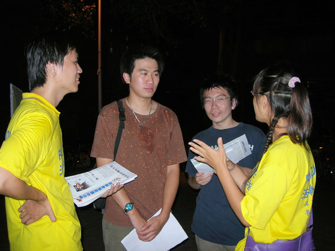 也有许多新生不明白对民众有益处的法轮功为何在中国大陆被残酷的镇压。学员们一一为他们解说着:法轮功给人们带来身心升华,受到民众欢迎,短短几年,修炼者即达到上亿之众。然而,中共的邪恶本质使它无法容忍“真善忍”的洪扬,中共前党魁江泽民更是妒火攻心。1999年6月10日,在中共江泽民的个人意志和淫威下,成立了凌驾于国家宪法和法律之上的全国性恐怖组织“610办公室”,1999年7月20日之后,江泽民又命令610办公室系统性的对数以千万计坚持信仰的中国法轮功学员实行“名誉上搞臭、经济上截断、肉体上消灭”,“打死白打、打死算自杀”、“不查身源、直接火化”的灭绝政策。在江泽民制造并推行国家恐怖主义的过程中,众多法轮功学员被打死打伤、妻离子散、居无定所、流离失所,亿万法轮功学员的家属、亲朋好友和同事受到不同程度的株连与洗脑。
