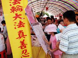 活动一开始,有不少民众看到摊位桌上摆着法轮功资料时,以肯定的语气说:“这是法轮功摊位喔?!”便直接走向摊位了解更多情况。透过法轮功学员的解说,他们明白了中国大陆法轮功学员因坚定“真、善、忍”信仰,至今已有2732人被中共迫害致死,而其中很多人的未成年子女因此被迫流离失所、饱受歧视、也失去正常求学的机会。