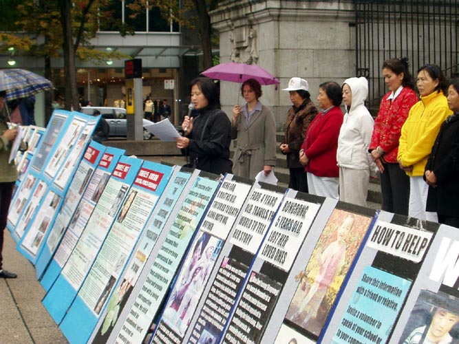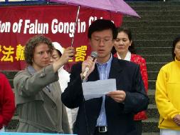 法轮功学员张春雨在新闻发布会上发言,他说,他的母亲杨惠珍于2004年5月24日第三次遭到中国丹东公安的绑架,至今关押在丹东市白房看守所。他制止中共对法轮功学员的迫害,呼吁加拿大政府阻止迫害法轮功的大连市长夏德仁入境。
