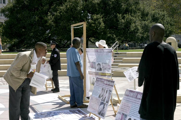 当天上午约11点,当学员摆好图片,并以真人示范在中国大陆的法轮功学员所遭受的部份酷刑时,吸引了过往人员的目光,驻足观看,并了解真象。