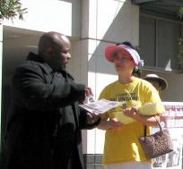 当得知,此时恰逢奥克兰的姐妹城市大连的市长夏德仁来访,他也是辽宁省的副省长;辽宁是法轮功受迫害最严重的地区之一,许多法轮功学员被迫害致死、致残,还发生了18名女学员被扒光衣服后投入男监的、令人发指的事件。学员在此是让更多的人了解什么是法轮功,及揭露迫害。许多人表示,你们做的很好。其中一位奥市工作人员说,感激学员把真象讲出来。有的还询问如何能帮助停止迫害。