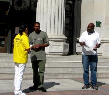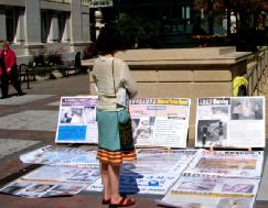 当天的讲真象活动,是在奥克兰市府大楼前的广场上。在此周围,美国联邦政府大楼、和加州政府大楼、与奥市的政府大楼比邻而立。到午餐时间,很多大楼内的工作人员会经过此地,有的还会在此休憩。