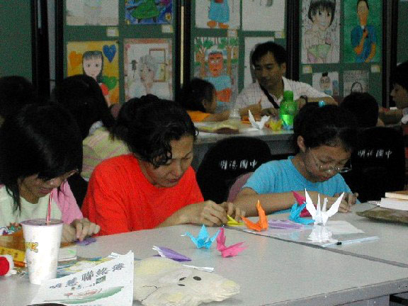 ![]() 授课老师仔细的对纸鹤的细部作调整 | ![]() 明慧小弟子专注又真诚的努力摺纸鹤 |