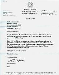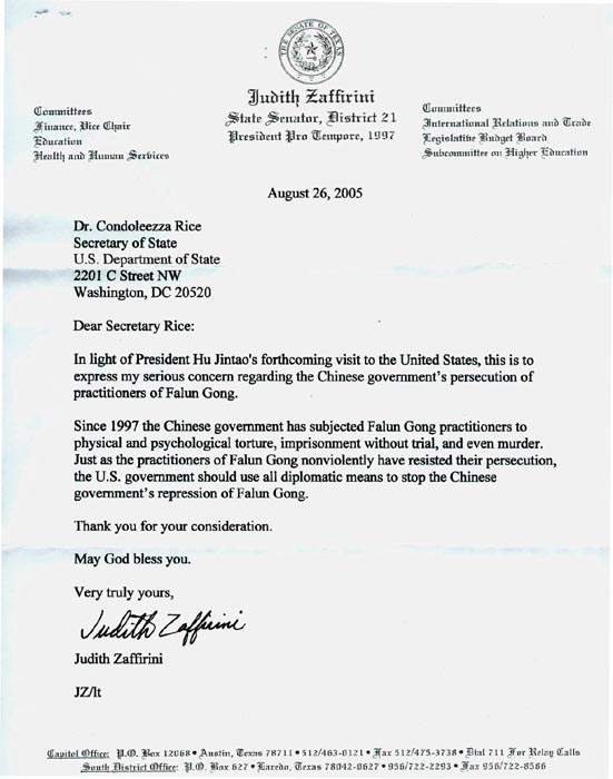 【明慧网2005年9月4日】8月26日,德州州参议员朱迪•泽夫雷尼(JUDITH ZAFFIRINI)女士致信美国国务卿莱斯,呼吁美国政府采用一切手段制止中共政府法轮功。信文如下: