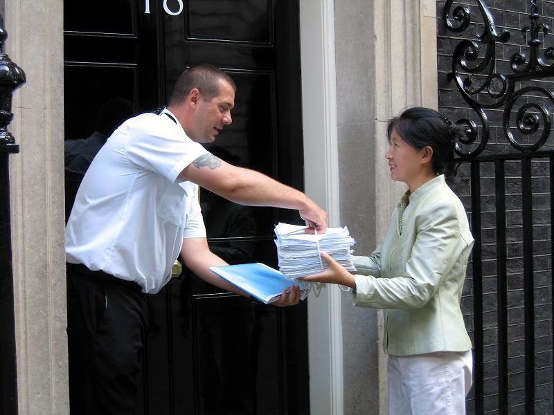 这次学员所递交的八千多个连署签名,是近来学员们在英国各地风雨无阻所发起的营救活动中所征集到的签名,这些签名不仅代表着法轮大法弟子坚忍不拔的精神,及成千上万民众的善心,更象征着来自各方代表正义良善的势力将风起云涌的歼灭一切邪恶不正的因素。