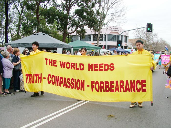 【明慧网2005年9月5日】9月3日,悉尼西区的圣玛丽镇举行了一年一度的迎春节,上万的民众观看了节日的,在大游行上法轮功团体格外引人注目,成为了该镇大游行的焦点,法轮功队伍所经之处不断地响起阵阵的掌声,在法轮功的摊位上要求学功和了解真象的人也络绎不绝。