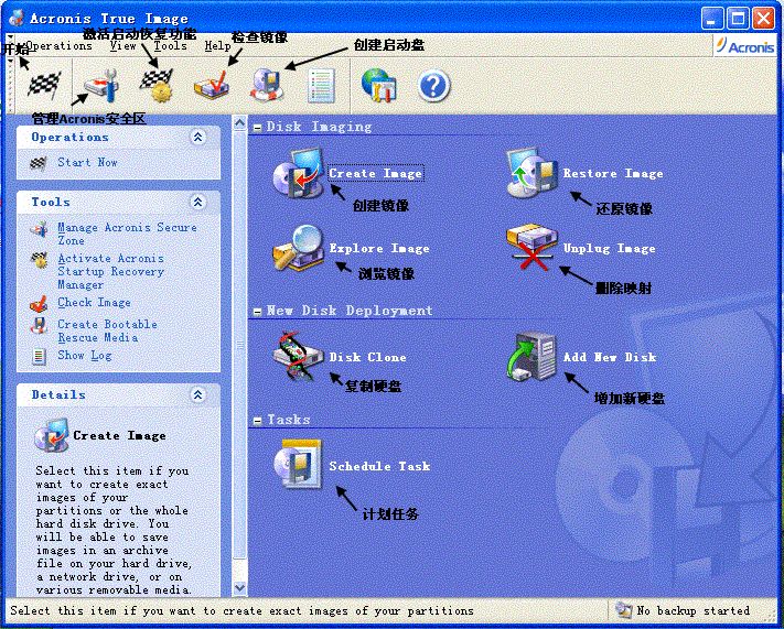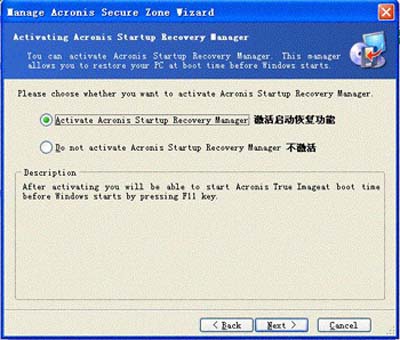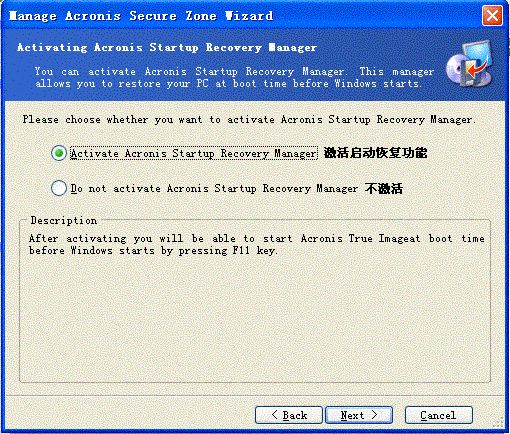 Activate Acronis Startup Recovery Manager(激活启动恢复功能),如果你刚才没有激活一键恢复功能,也可以以后点击该图标激活它。