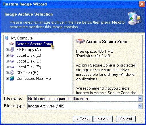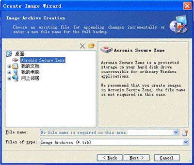 前面我曾提到过可以把镜像文件存放到“Secure Zone”以外的分区上,当我们选择好位置并命名后,点击“Next”;后面的操作和前面大体一样,只是在最后会询问我们是否分卷(这类似于WinRAR的分卷压缩功能),其后还会询问是否设定密码等。所有的操作完成后,就会生成一个后缀名为“tib”的镜像文件,我们可以直接在Windows下查看、移动、删除、重命名该镜像文件,这样就可以更加方便、灵活、直观的管理我们的镜像了。