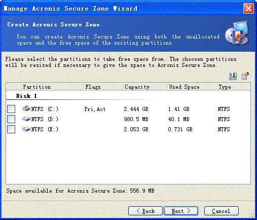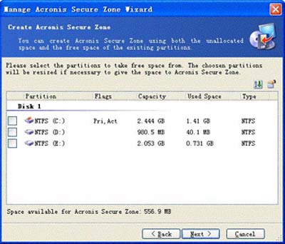 4.选择从哪块硬盘上创建Secure Zone,这将在你的硬盘上分出一块空间来创建隐藏分区。你也可以保持默认设置,直接”Next”