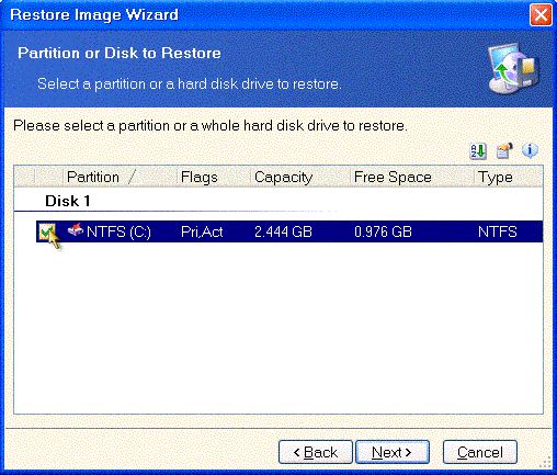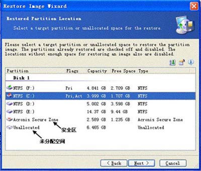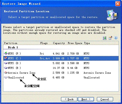 4.选择将镜像恢复在哪块分区,我们选择恢复到C盘。注意!“ATI”会列出所有的具有足够空间的分区和未分配空间供你选择,如果你选择了其它分区,“ATI”会将该分区的内容替换成镜像文件中的内容!