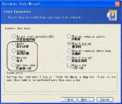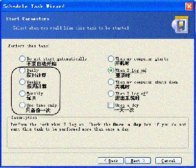 你可以设定电脑在规定的时间内自动备份,而且,这一切操作都是在Windows运行的情况下在后台完成的,丝毫不会打断你的工作。具体操作和前面的备份一样,只是最后会出现一个选项,让你选择在什么时间自动备份。如果你选择了这四个选项,还要设定具体的备份时间。你也可以设定多个任务哟。