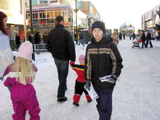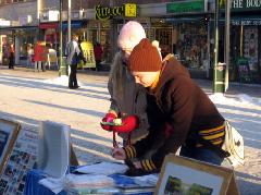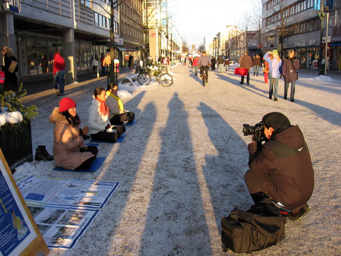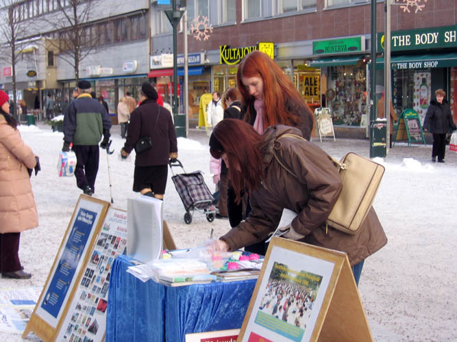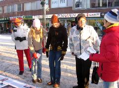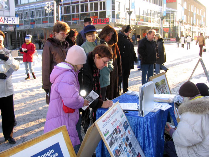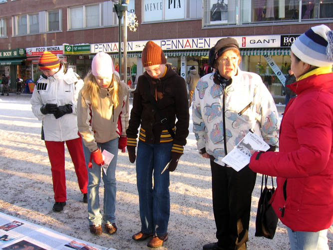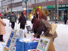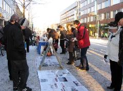 虽然是冰天雪地的严冬,但这天中午阳光明媚,过往的行人络绎不绝。看到法轮功真相展板,许多人停下脚步认真阅读;许多人接到学员递上的真相资料,立即开始翻阅;有的人直接走到征签桌前,主动签名声援反迫害。