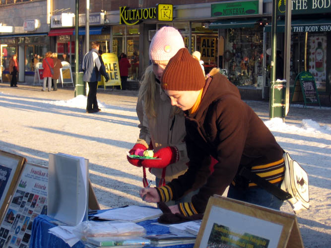 有两个女孩,看到迫害照片后非常吃惊的问,这些都是什么人啊?学员告诉她们,这是法轮功学员在中国被警察残酷迫害的真实情况,两个女孩说,怎么能发生这样的事。当仔细看了所有展板明白后,又问道,我们还没到18岁,可以签名吗?学员说,当然可以。她们立即签了名声援制止迫害。