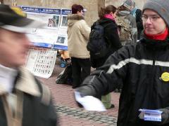 当天,法轮功学员伴随着大法的音乐炼着缓慢柔和的五套功法,路人被这祥和的场面所吸引,纷纷前来观看阅读揭露中共迫害法轮功的真相展板。尽管天气寒冷,但人们了解真相的热情并没有降低,有些人了解了真相后马上在要求停止迫害的抗议信上签上了自己的名字。