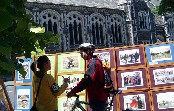 ![]() 植物园门前的摄影展 | ![]() 来进一步了解法轮大法功法和功理的参观者 |