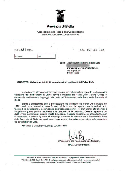我们了解到(中共)对法轮大法修炼者的迫害始于1999年,为了迫害修炼者,一直不断的变换着迫害的形式,比如酷刑、流放、劳教,和针对法轮功的造谣宣传。这种剥夺人最基本的思想、信仰、言论和结社自由权利的行为是不能接受的。对此我们建议你们加入比埃拉省(Provincia di Biella)的和平圆桌会议,以便你们更好的传播真相,让人们了解中国的人权状况。