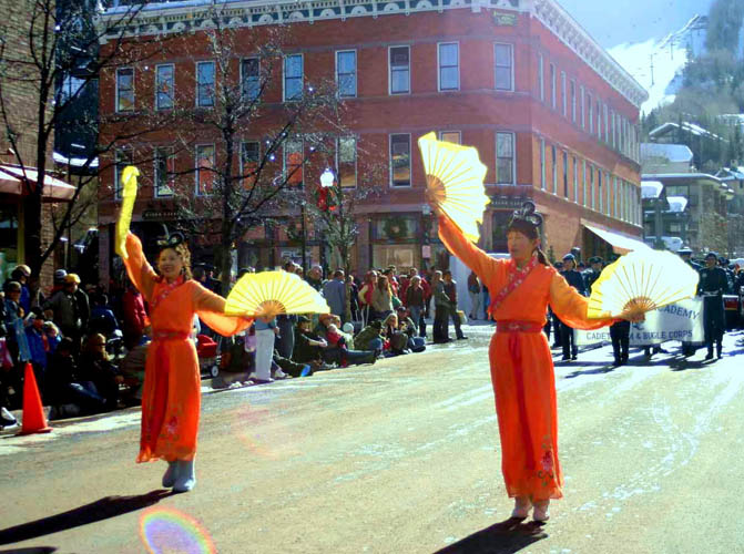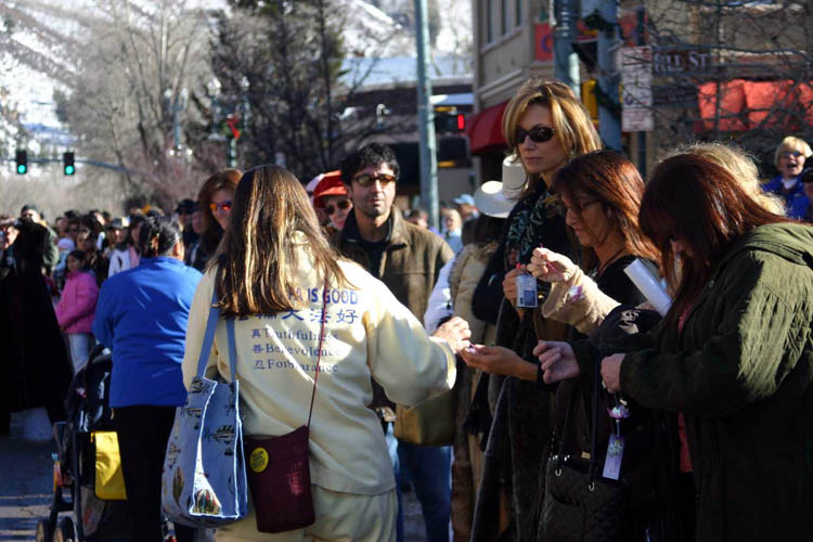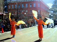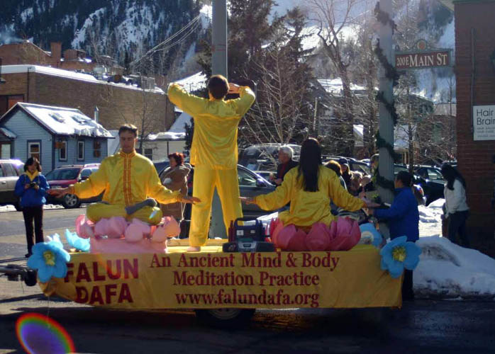 【明慧网2006年1月17日】2006年1月14日,美国科罗拉多州法轮功学员参加了艾斯本冬日节(Aspen Winter Festival)游行,受到民众的欢迎。