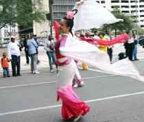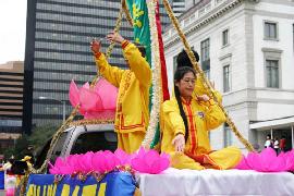法轮功学员的游行队伍,前面是英文“法轮大法--真、善、忍”横幅,后面是腰鼓队、唐鼓队、唐装舞、明慧学校小弟子,花车上有学员展示法轮功的功法,这次游行还展示在中国遭受迫害的法轮功学员图文横幅,引人注目。