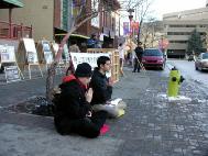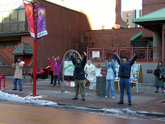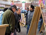 ![]() 图片展现场,法轮功学员在炼功 | ![]() 几位老人在听天安门自焚真相 | ![]() 法轮功学员在讲真相 |