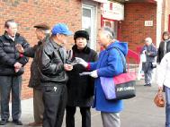 一位70多岁的老人,拄着拐杖,看了反酷刑展,在图片展前长时间的驻留。尤其对天安门自焚伪案的真相很是惊讶,这时,一位法轮功学员给他介绍了整个过程,以及详细的疑点分析,说明自焚伪案完全是中共一手导演,老人一直点头称是,也引来了更多市民来听真相。