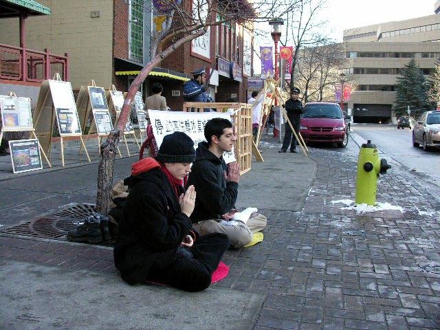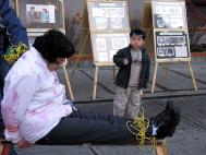 还有一位5-6岁的小孩,在父母的引领下,到了反酷刑展前。当看到被捆绑在老虎凳上,脸上被“打”的青紫,还渗透着“鲜血”的演员时,不停的左看右看,一脸的疑惑。经了解,这位小孩是随父母移民加拿大的越南人,看到酷刑演示时,刚开始还以为是发生在过去的事情,当了解到这场对法轮功学员的迫害就在现在的中国大陆发生着,而且持续了6年多,至少2800多名学员被迫害致死时,他惊讶的张大了嘴巴,到离开的时候,他对法轮功学员说:“愿迫害早点结束。”