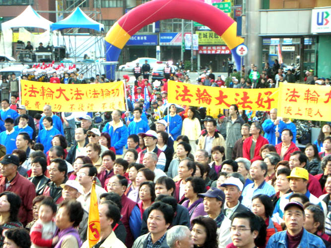 上午8点20分,桃园县朱立伦县长亲临升旗典礼会场,他朝民众走来,并亲切的与前排的法轮功学员们握手。朱县长在升旗之后率同地方代表一起参与“自由车铁马行”的活动。与此同时,广场上则扬起一阵优美音乐,作为第一个出场表演的节目─“法轮功功法表演”要上场了。大人、小孩都将目光聚焦于广场上,甚至有民众当场就跟着学员的动作比划起来。