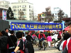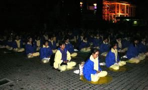 法轮功学员是第一个来到广场前的团体。在别的社团都还没来之时,清冷的黎明之中,更显出法轮功学员们坚忍不拔的毅力。
