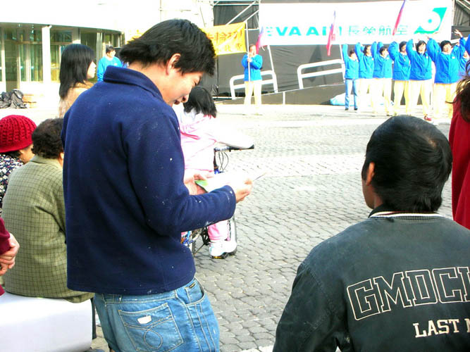 随着大法真相的广传与深入人心,人们对大法的态度也有大幅度的转变,从1999年的冷漠、旁观,到现在的同情、理解、欢迎。看那一双双专注凝望的眼神,是啊,是法轮功学员们把希望一次又一次的带来,一次又一次的讲真相,才唤醒了他们沉睡的良知。