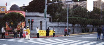 2006年1月1日清晨,天还蒙蒙亮,早起的民众有的三三两两、有的携家带眷、有的呼朋引伴、有的成群结队陆续的进入总统府前广场。昏暗的天色下,广场边法轮功学员所展示的,写着“法轮大法 真善忍 使上亿人身体健康 人心向上”的黄色大横幅特别显眼。