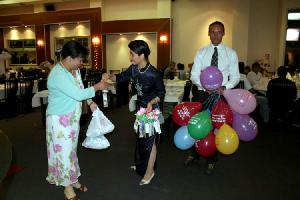 新郎不修炼,他的家族非常庞大,都是从中国大陆台山来新西兰的老华侨,加上新郎的朋友同学,前来参加婚礼的有一百多人。在惠灵顿,这么多华人聚集在一起的机会还真不多。为了把法轮大法的美好带给每一位有缘人,法轮功学员们准备了许多充满祝福的洪法莲花书签及气球以供婚礼后派发。