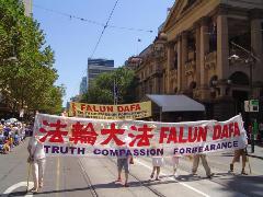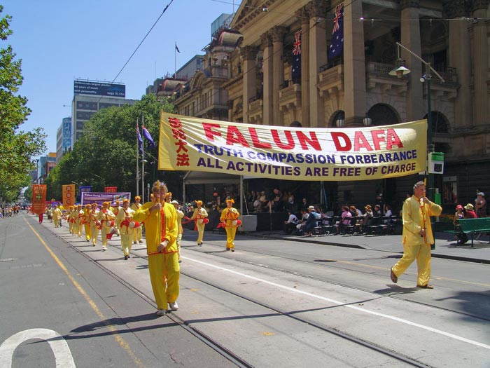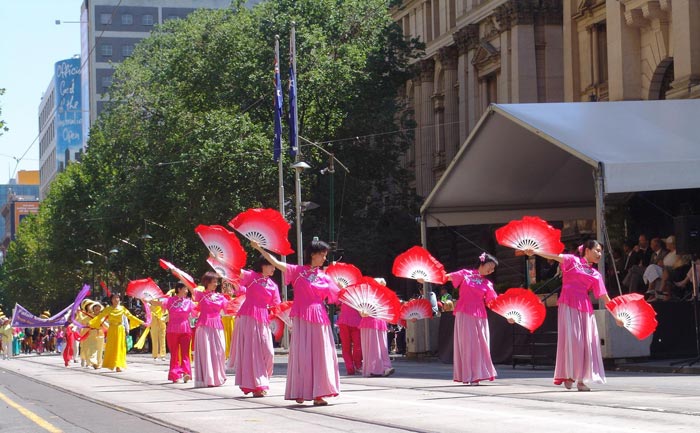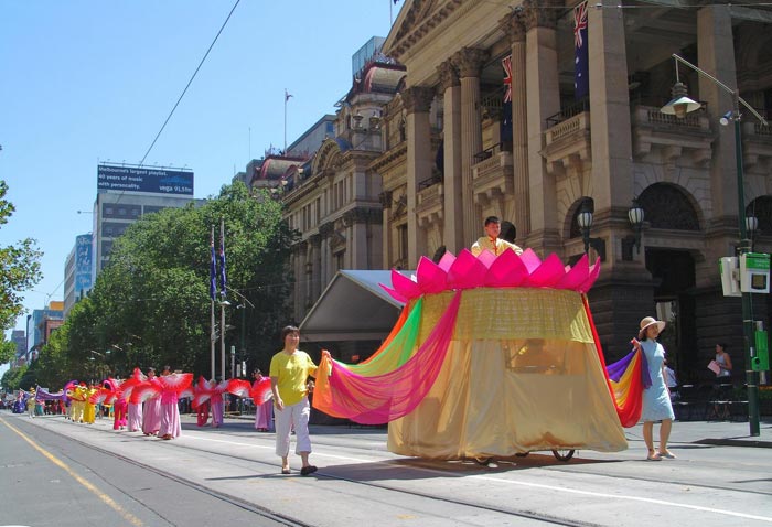 游行团体由身穿盛装的各个民族社团组成,还有花车、腰鼓队、舞蹈等。维省总督、省长、市长和议员们在主席台观礼,主持者介绍每一个经过主席台前的游行队伍,当法轮功学员经过时,主持人看到中英文书写的“真、善、忍”横幅时有感而发:“真善忍的队伍过来了,他们的笑容体现了他们信奉的真善忍,真善忍对我们所有的社团都有好处。”